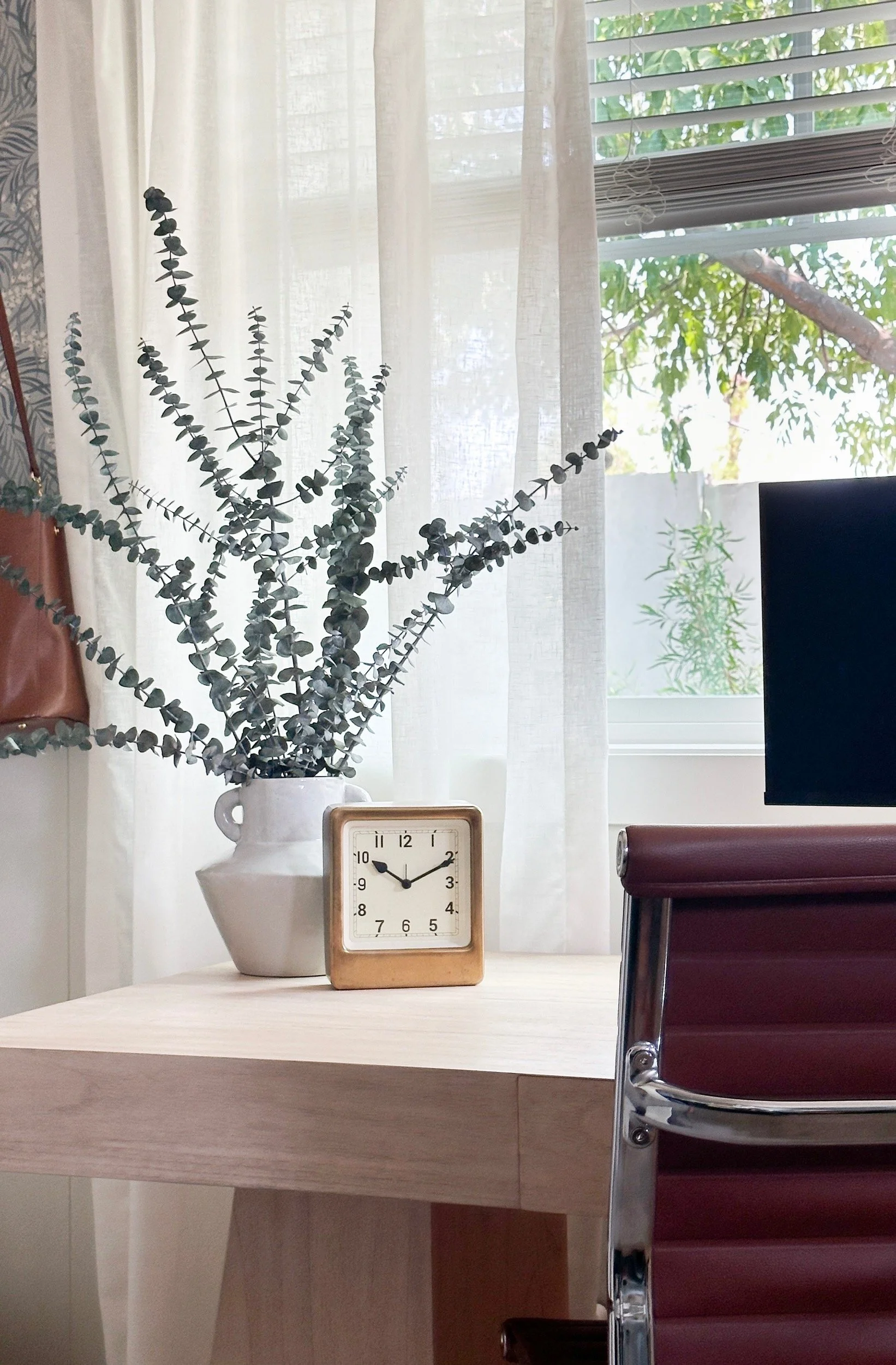 Becca: “Oh my gosh, it has made working from home so much more enjoyable! I look forward to sitting down at my desk every day. The space is serene and calm, which really boosts my creativity. I especially love looking out the window and seeing the tree with birds—it’s such a refreshing vibe.”